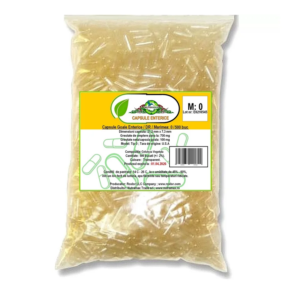 Capsulele comercializate de firma Nutramax Trade SRL, sunt capsule vegetale goale, grad farmaceutic, fabricate in SUA folosind un standard de productie de inalta calitate, din materiale sigure si sterile. Capsulele vegetale Enterice / DRcaps® sunt capsule acoperite enteric cu eliberare intarziata. Datorita rezistentei mari la dizolvare in stomac, absorbtia acestora in organism are loc mai tarziu, astfel incat substantele ingerate se dizolva in mod normal in intestinul subtire. Pentru a obtine o livrare intestinala optima, capsula DRcaps® trebuie sa fie suficient de rezistenta, pentru a rezista cu bine mediilor acide din stomac si a nu se dizolva inainte de a ajunge in intestinul subtire.