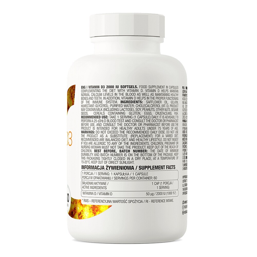 • Vitamina D3 2000 UI este importantă pentru funcționarea normală a tuturor sistemelor din organismul nostru. Vitamina D3 poate fi obținută în principal de la lumina soarelui. Totuși, aceasta nu este mereu suficientă pentru a menține aportul adecvat. Prin urmare, trebuie obținută din suplimente alimentare. O capsulă conține până la 2000 UI de vitamina D3, ce poate acoperi doza zilnică recomandată din această vitamină. Vitamina D susține absorbția și utilizarea corespunzătoare a calciului și a fosforului în organism. De asemenea, ajută la menținerea nivelului normal de calciu din sânge, susține funcționarea corectă a masei musculare și a sistemului imunitar și susține menținerea sănătății oaselor și a dinților.