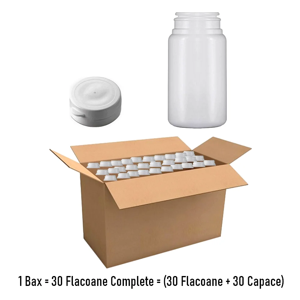 Produs comercializat la bax : 30 Bucati ! Flaconul farmaceutic HDPE cu capacitate de 150 ml (sau 90-100 capsule marimea 0) de culoare alba este ideal pentru pastrarea capsulelor preparate de voi acasa. Flaconul pastreaza capsulele igienic, uscate si sterile datorita capacului care se inchide ermetic, prin presare. In plus, puteti eticheta flaconul cu etichete autocolane marimea 65x150 mm ca sa stiti ce capsule contine, fara sa-l deschideti.